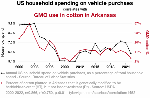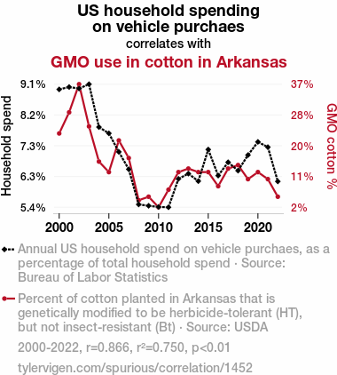 This means 75% of the change in the one variable (i.e., GMO use in cotton in Arkansas) is predictable based on the change in the other (i.e., US household spending on vehicle purchaes) over the 23 years from 2000 through 2022.