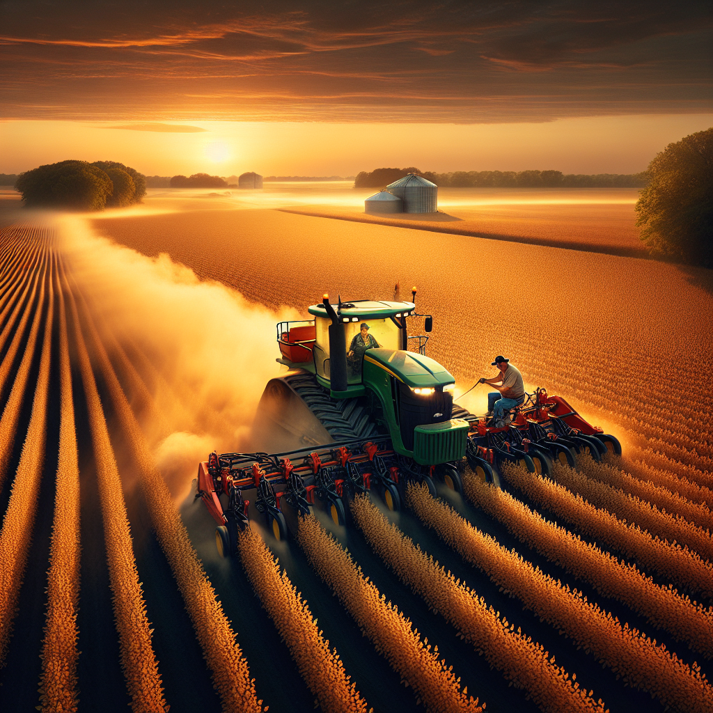 Prompt: Generate an image that represents a TIME magazine cover featuring the following scene: In the heart of a vast Ohio soybean field, a farmer operates a modern tractor, emitting a trail of exhaust as it plants genetically modified soybean seeds. As the sun sets, a warm orange glow blankets the fields, illuminating the dynamic blend of farming technology, nature, and agriculture. The scene should capture the juxtaposition of innovative farming methods against the serene beauty of the natural landscape. The depiction should include only scenes, people, and objects, it should not include text or speech bubbles.