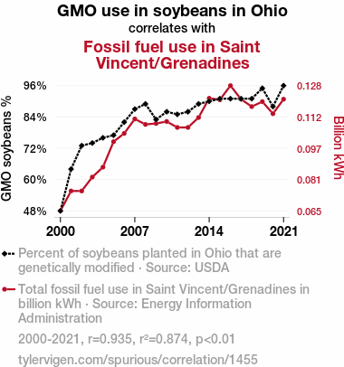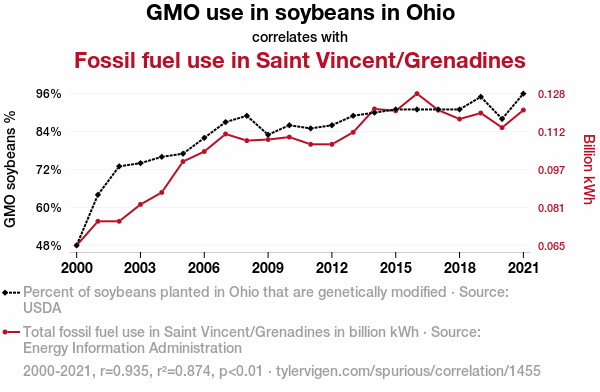 - The spurious research paper: The Soybean and Fossil Fuel Tango: Unraveling the Relationship Between GMO Use in Ohio and Fossil Fuel Consumption in Saint Vincent/Grenadines
