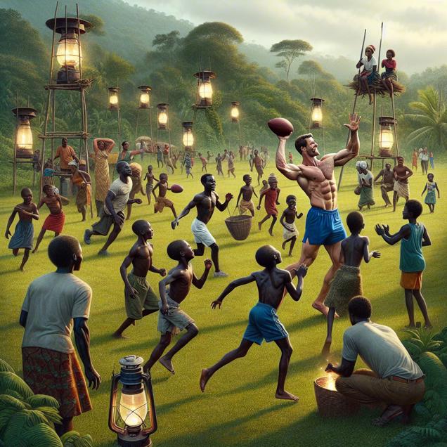 User prompt: Please respond with an image generation prompt that would be likely to create an interesting visual using DALLE-3, using the following style: [ A TIME magazine cover image ] and depicting this scene: In a grassy field in Equatorial Guinea, Drew Brees can be seen tossing a football to a group of young children as they excitedly attempt to catch his passes. Meanwhile, nearby, a group of workers are carefully refilling lanterns with kerosene to ensure the evening festivities are well-lit. Keep the visual depiction simple. Do not include any words or speech bubbles.