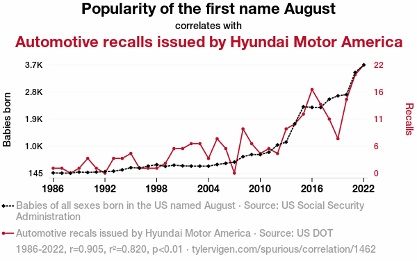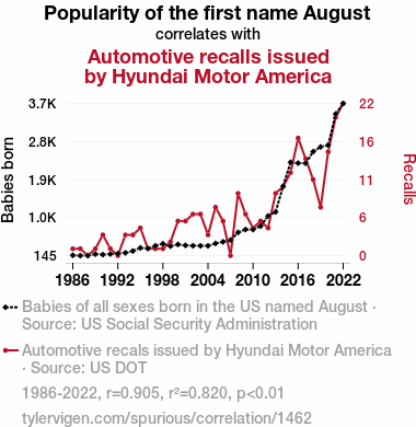 This means 82% of the change in the one variable (i.e., Automotive recalls issued by Hyundai Motor America) is predictable based on the change in the other (i.e., Popularity of the first name August) over the 37 years from 1986 through 2022.