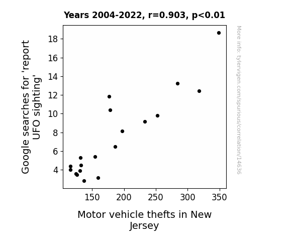 This means 81.5% of the change in the one variable (i.e., Motor vehicle thefts in New Jersey) is predictable based on the change in the other (i.e., Google searches for 'report UFO sighting') over the 19 years from 2004 through 2022.