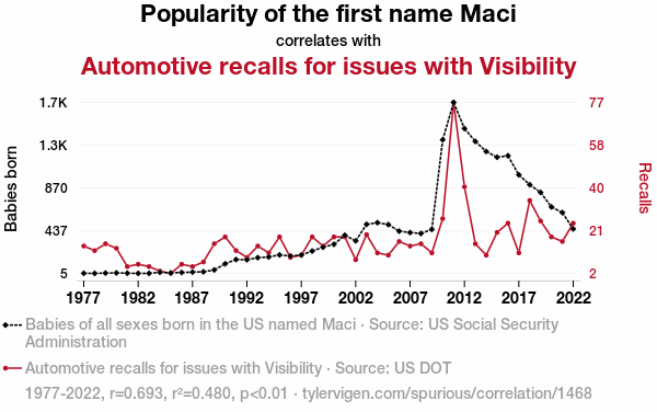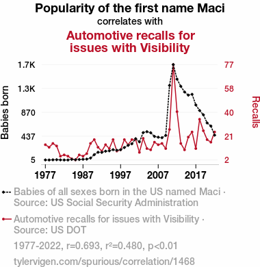 "Maci name popularity", "automotive visibility recalls", "US Social Security Administration data", "US Department of Transportation data", "correlation between name popularity and automotive recalls", "vision-related manufacturing defects", "automotive safety concerns", "Maci first name correlation coefficient", "Maci name and automotive recalls", "Maci visibility recall correlation".