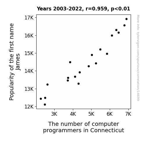 This means 91.9% of the change in the one variable (i.e., The number of computer programmers in Connecticut) is predictable based on the change in the other (i.e., Popularity of the first name James) over the 20 years from 2003 through 2022.