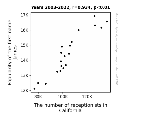 This means 87.2% of the change in the one variable (i.e., The number of receptionists in California) is predictable based on the change in the other (i.e., Popularity of the first name James) over the 20 years from 2003 through 2022.