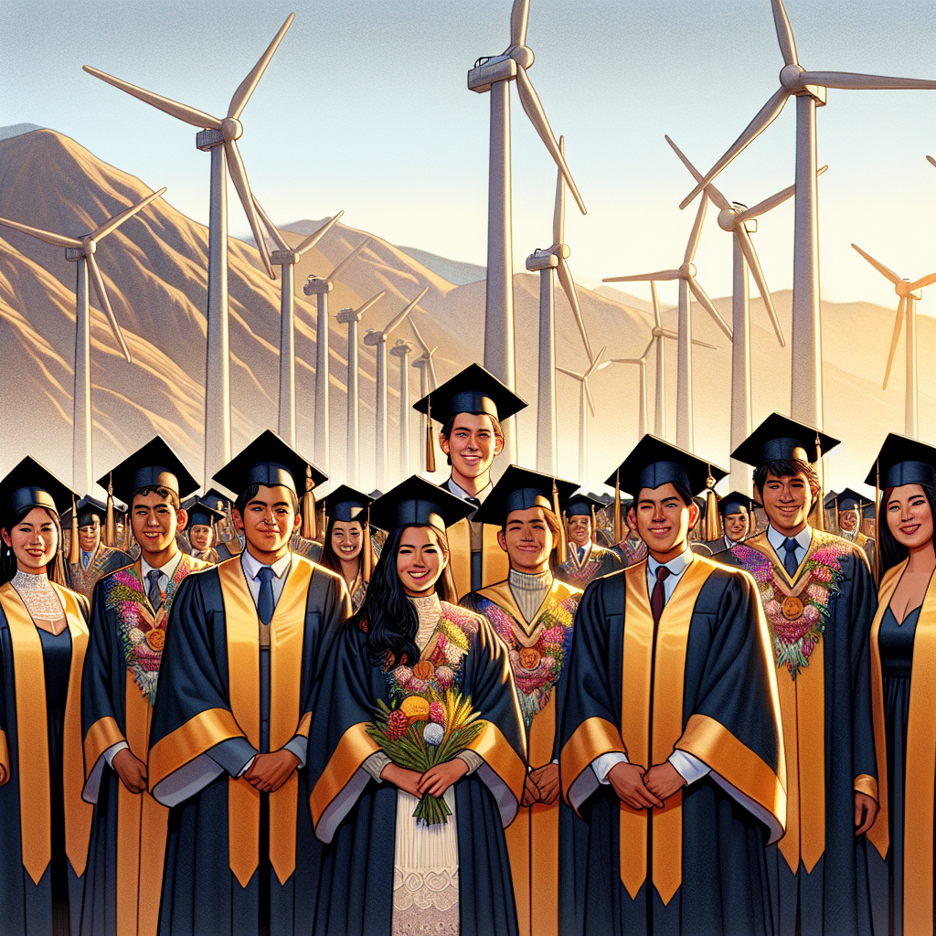 Prompt: Create an image of a graduation ceremony taking place at a picturesque small college in Bolivia. The students, wearing elegant graduation gowns and caps, are standing in front of a backdrop of towering wind turbines gracefully turning, generating clean electricity for the surrounding countryside. The scene is bathed in warm, natural light, and the students are filled with the sense of accomplishment as they receive their Associates degrees in Business Administration. The depiction should include only scenes, people, and objects, it should not include text or speech bubbles.