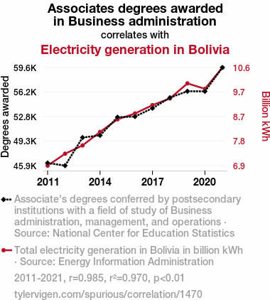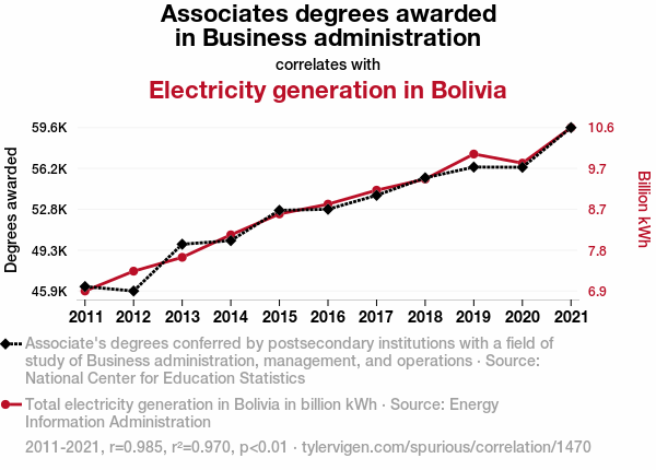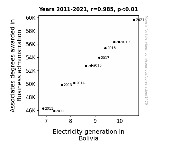 This means 97% of the change in the one variable (i.e., Electricity generation in Bolivia) is predictable based on the change in the other (i.e., Associates degrees awarded in Business administration) over the 11 years from 2011 through 2021.