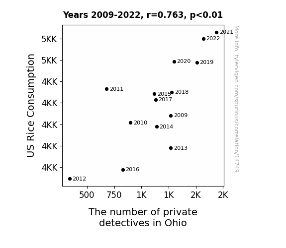 This means 58.3% of the change in the one variable (i.e., The number of private detectives in Ohio) is predictable based on the change in the other (i.e., US Rice Consumption) over the 14 years from 2009 through 2022.
