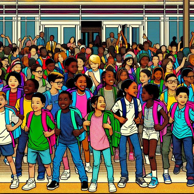 Prompt: Generate a comic-book-style illustration with muted colors and a dotted halftone pattern from the 1960s, depicting a group of lively 3rd graders lined up outside a Las Vegas hotel. Each child holds a colorful backpack and eagerly waits to check in. The number of 3rd graders matches the number of hotel room check-ins, creating a vibrant and bustling scene. The illustration is composed with simple yet energetic lines, effectively capturing the excitement and chaos of the moment. The depiction should include only scenes, people, and objects, it should not include text or speech bubbles.