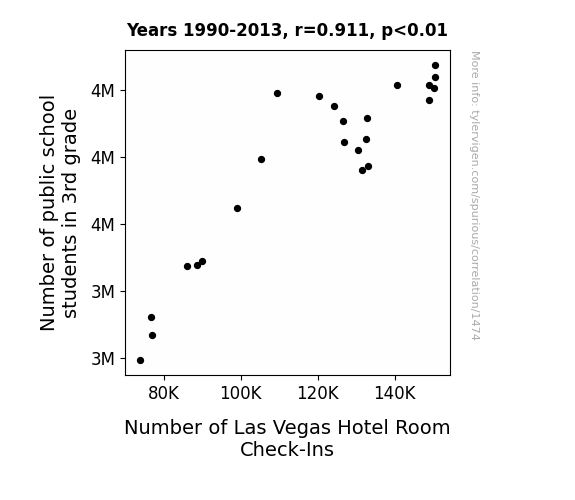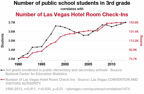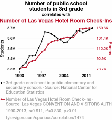 - The spurious research paper: Putting the School in Session on the Vegas Strip: An Analysis of the Relationship Between 3rd Grade Enrollment and Hotel Room Check-Ins
