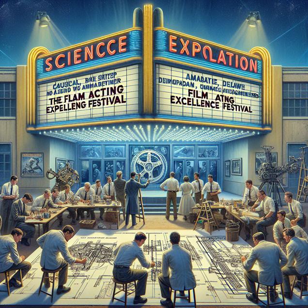 Prompt: Generate an image that looks like the cover of a Discovery magazine, featuring a movie theater marquee as the central focus. The marquee should prominently display "Tom Hanks Festival" in big letters, with his famous film titles surrounding it. In front of the theater, portray a group of mechanical engineers from Delaware gathered around a large blueprint, actively brainstorming and designing new mechanical systems as the secondary focus. The scene should exude a sense of innovation and technology intertwined with the excitement of film. The depiction should include only scenes, people, and objects, it should not include text or speech bubbles.