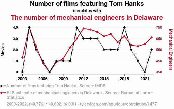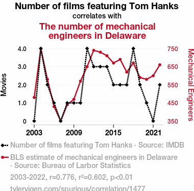 - The spurious research paper: Forrest Gump's Impact: Exploring the Hanks-On Relationship Between Tom Hanks Movies and the Quantity of Mechanical Engineers in Delaware