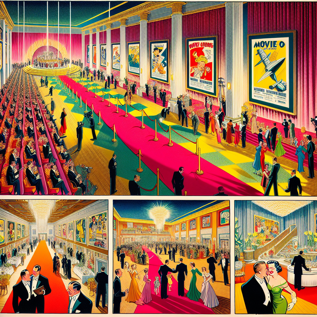 Prompt: An image that looks like it is a scene from A Disney Movie, illustrating a bustling movie premiere event at a grand hotel ballroom. The scene showcases a long red carpet stretching out from the entrance, with movie posters adorning the walls. Inside the ballroom, guests are elegantly dressed, and the atmosphere is filled with excitement and glamour. Meanwhile, in the hotel's lobby, luxurious accommodations are on display with guests enjoying the lavish amenities, symbolizing the thriving revenue per available room in the US hotel industry. The depiction should include only scenes, people, and objects, it should not include text or speech bubbles.