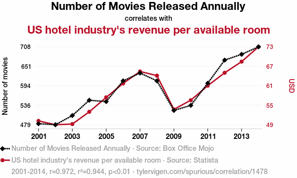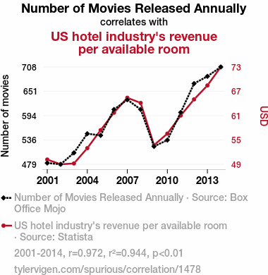 movie releases, US hotel revenue, Hollywood, Box Office Mojo, Statista, correlation coefficient, hotel industry, revenue per available room, blockbuster sequel, movie industry, hospitality industry