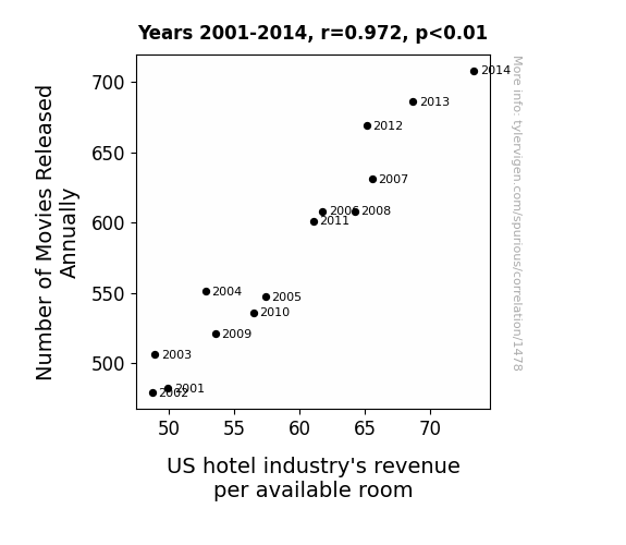 This means 94.4% of the change in the one variable (i.e., US hotel industry's revenue per available room) is predictable based on the change in the other (i.e., Number of Movies Released Annually) over the 14 years from 2001 through 2014.