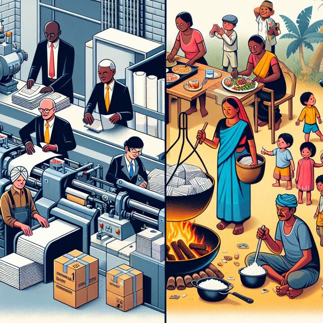 ChatGPT: Generate an image that features a scene split into two parts: In the left half, focus on a group of paper goods machine setters, operators, and tenders in Nebraska who are busy packaging and sorting various paper products. In the right half, depict a family in the Solomon Islands that is using liquefied petroleum gas for cooking in their outdoor kitchen. Both scenes should be clear and distinct, capturing the activity of the individuals in each location. Keep the visual depiction simple without any words or speech bubbles.
