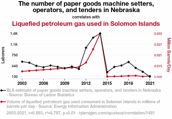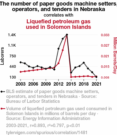 This means 79.7% of the change in the one variable (i.e., Liquefied petroleum gas used in Solomon Islands) is predictable based on the change in the other (i.e., The number of paper goods machine setters, operators, and tenders in Nebraska) over the 19 years from 2003 through 2021.