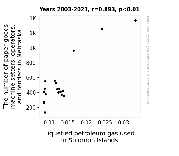 User prompt: Please provide potential search keywords for a paper titled Rolling in the Links: Unraveling the Wacky Connection Between Paper Goods Machine Setters in Nebraska and Liquefied Petroleum Gas Consumption in Solomon Islands with an abstract of In this paper, we delve into the tête-à-tête between the number of paper goods machine setters, operators, and tenders in Nebraska and the consumption of liquefied petroleum gas in the sunny Solomon Islands. Your eyes do not deceive you - we are indeed exploring the correlation, or perhaps collision, between these two seemingly unrelated factors. Using data from the Bureau of Labor Statistics and the Energy Information Administration, our research team uncovered a correlation coefficient of 0.8926681 and p < 0.01 for the years 2003 to 2021. Our findings not only raise eyebrows, but also tickle the funny bone, as we unravel this peculiar connection with a pinch of statistical flair and a dash of cheeky humor. So, grab your popcorn and get ready for some sizzling insights that will leave you with a smile and maybe even a gasp!