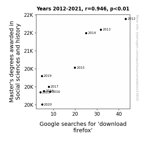 This means 89.4% of the change in the one variable (i.e., Google searches for 'download firefox') is predictable based on the change in the other (i.e., Master's degrees awarded in Social sciences and history) over the 10 years from 2012 through 2021.