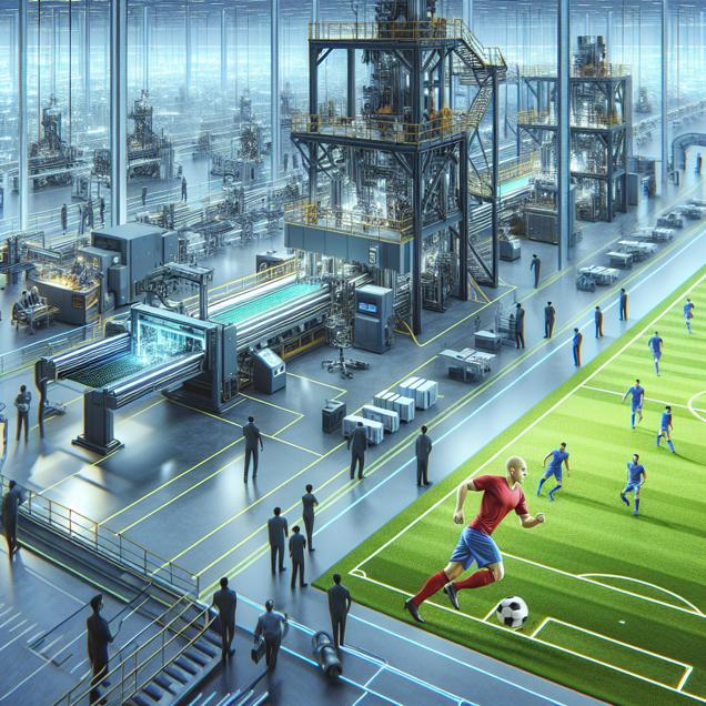 Prompt: Prompt: Generate an image of a futuristic manufacturing facility in a vast open space, where high-tech industrial cutting and trimming machines are being operated by busy workers. Adjacent to the facility, there is a football field where Adrian Wilson, a skilled player, is making swift tackles, inhibiting the opposition's progress. The scene should exude a high-tech ambiance and showcase the seamless coexistence of advanced machinery and human athletic prowess. The depiction should include only scenes, people, and objects, it should not include text or speech bubbles.