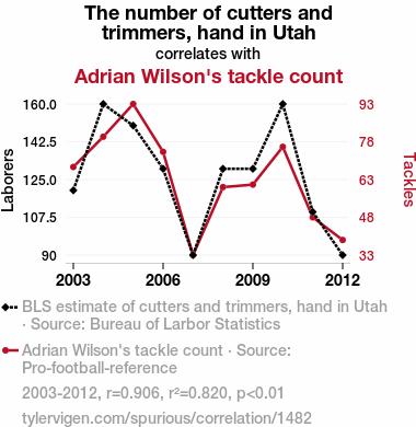 This means 82% of the change in the one variable (i.e., Adrian Wilson's tackle count) is predictable based on the change in the other (i.e., The number of cutters and trimmers, hand in Utah) over the 10 years from 2003 through 2012.