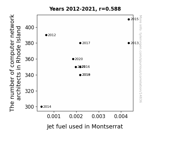 This means 34.5% of the change in the one variable (i.e., Jet fuel used in Montserrat) is predictable based on the change in the other (i.e., The number of computer network architects in Rhode Island) over the 10 years from 2012 through 2021.