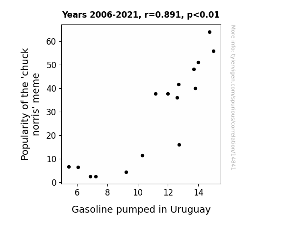 This means 79.4% of the change in the one variable (i.e., Gasoline pumped in Uruguay) is predictable based on the change in the other (i.e., Popularity of the 'chuck norris' meme) over the 16 years from 2006 through 2021.