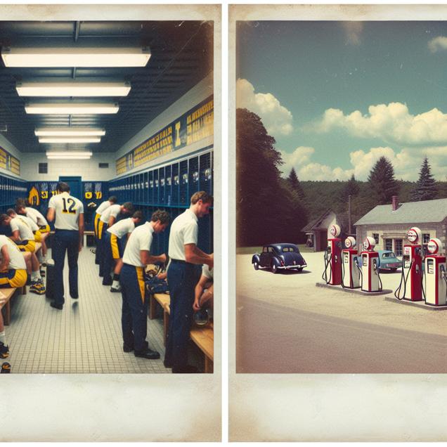Prompt: **Image Generation Prompt:** Style: _a vintage Polaroid photo_ Scene: In the bustling Michigan locker room, a group of attendants is attending to athletes, helping them gear up for their games. The room is filled with a sense of anticipation and energy. Meanwhile, across the ocean in France, a row of vintage gas pumps stands against a backdrop of a quaint countryside, with cars lining up to fill up with gasoline. The scene exudes a timeless charm and captures the contrast between the two locations through the lens of nostalgia. The depiction should include only scenes, people, and objects, it should not include text or speech bubbles.