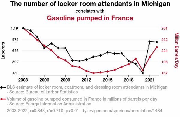 locker room attendants, Michigan, gasoline consumption, France, correlation coefficient, Bureau of Labor Statistics, Energy Information Administration, unconventional correlations