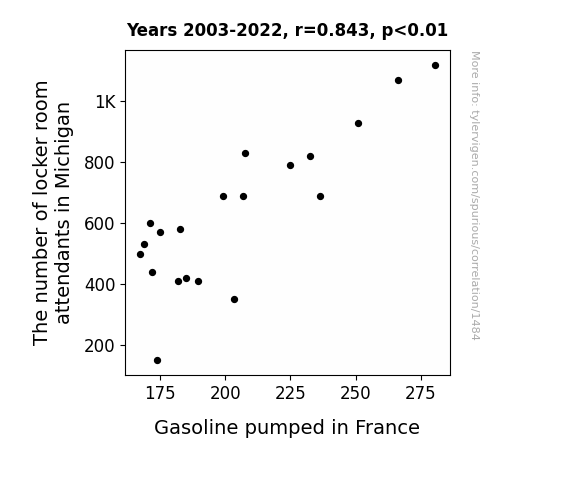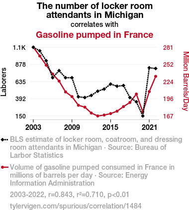 - The spurious research paper: Fuel for Thought: Exploring the Unlikely Link Between Locker Room Attendants in Michigan and Gasoline Consumption in France