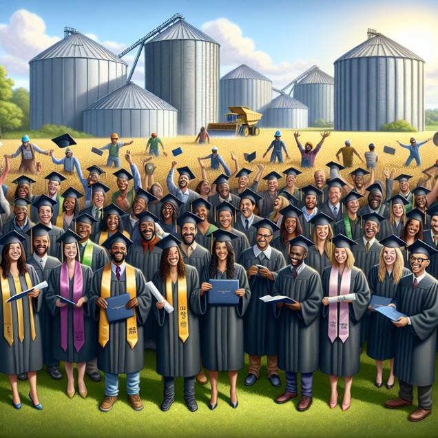 Prompt: "Generate [ A photo-realistic image ] of a group of proud graduates wearing caps and gowns in a sunlit park, holding their Bachelor's degree certificates in parks, recreation, leisure, fitness, and kinesiology. They are surrounded by towering silos filled with grains, as workers load massive shipments onto cargo ships bound for export. Keep the visual simple and do not include any words or speech bubbles." The depiction should include only scenes, people, and objects, it should not include text or speech bubbles.