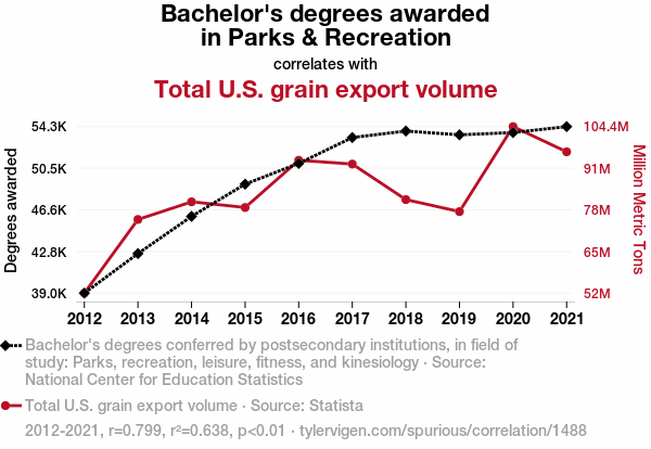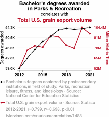 - The spurious research paper: Peculiar Parks, Plentiful Protein: Examining the Exquisite Entanglement Between Bachelor's Degrees in Parks, Recreation, Leisure, Fitness, and Kinesiology and Total U.S. Grain Export Volume