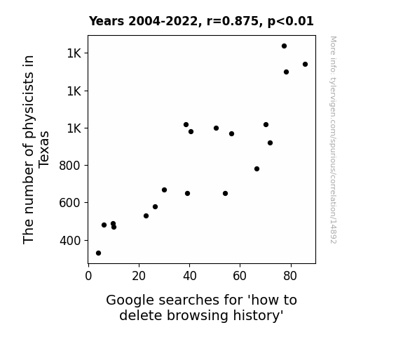 This means 76.5% of the change in the one variable (i.e., Google searches for 'how to delete browsing history') is predictable based on the change in the other (i.e., The number of physicists in Texas) over the 19 years from 2004 through 2022.