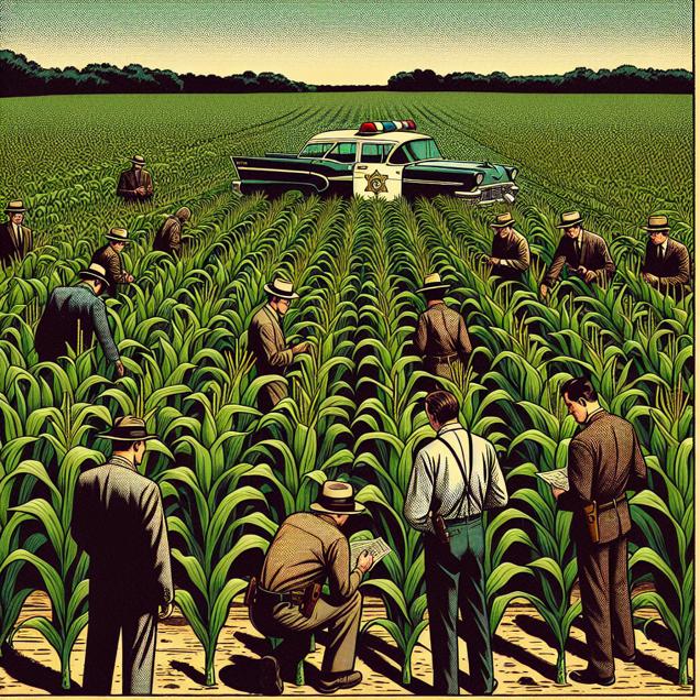 ChatGPT: Generate an image of a comic-book-style illustration with muted colors and a dotted halftone pattern from the 1960s. The scene depicts a field in Missouri with tall rows of genetically modified corn stretching into the distance. In the midst of the crops, a police car is parked, and officers are investigating a scene of a recent violent crime. The visual should capture the simplicity of the comic book style, with attention to details such as the texture of the cornfield and the classic muted color palette reminiscent of the 1960s.