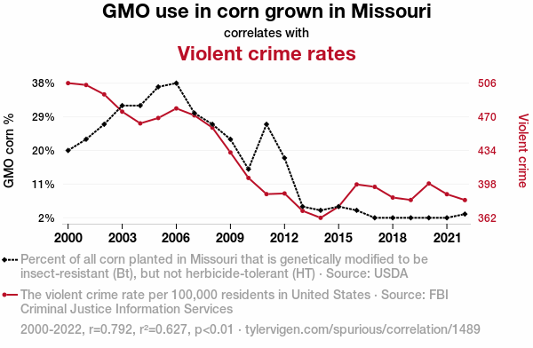A linear line chart with years as the X-axis and two variables on the Y-axis. The first variable is GMO use in corn grown in Missouri and the second variable is Violent crime rates.  The chart goes from 2000 to 2022, and the two variables track closely in value over that time. Small Image