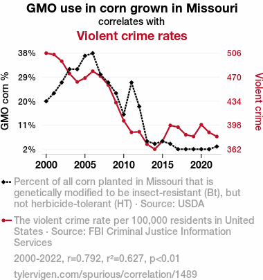 genetically modified corn, GMOs, corn cultivation, Missouri, violent crimes, USDA data, FBI Criminal Justice Information Services, correlation coefficient, statistical relationship, local crime rates