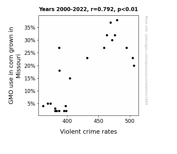 In examining the potential connection between the use of genetically modified organisms (GMOs) in corn grown in Missouri and the prevalence of violent crimes, our analysis revealed a remarkably strong correlation coefficient of 0.7917998. This suggests a strong positive relationship between the adoption of GMOs in corn cultivation and the incidence of violent crimes in the state. It's like they say, "You can't escape the corn-nection!"
