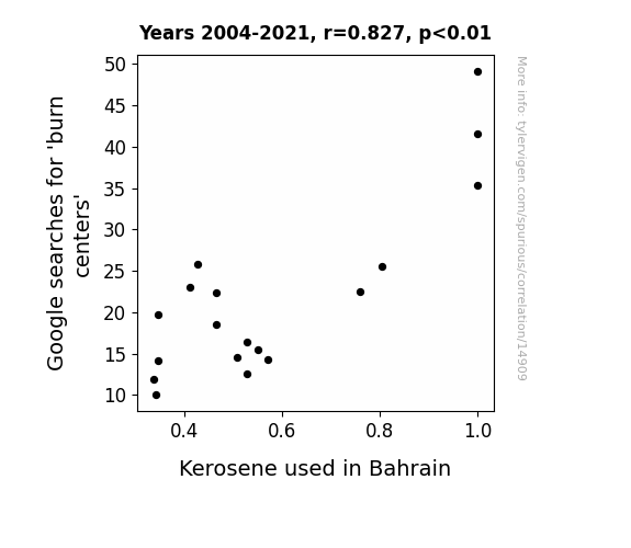 This means 68.4% of the change in the one variable (i.e., Kerosene used in Bahrain) is predictable based on the change in the other (i.e., Google searches for 'burn centers') over the 18 years from 2004 through 2021.