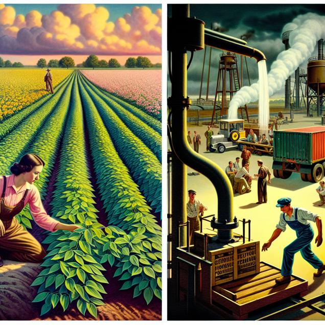 ChatGPT: An image that looks like it is a scene from a Pixar movie, portraying the two simultaneous scenes: In a Missouri field, large soybean plants with bright green leaves stand tall under the sunny sky. A farmer is inspecting the healthy crop, which has been genetically modified to resist pests and produce higher yields. Meanwhile, in Poland, a group of workers is using liquefied petroleum gas to power a forklift as they load crates onto a truck for transportation. The two scenes represent the simultaneous use of GMO soybeans in Missouri and the use of liquefied petroleum gas in Poland. The image should emphasize the vibrant colors of the soybean plants and the sunny sky, as well as the industrial setting of the workers loading crates onto the truck, with a focus on the contrasting environments of the two settings.