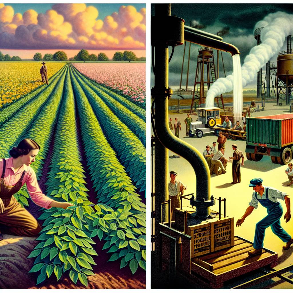 Prompt: An image that looks like it is a scene from a Pixar movie, portraying the two simultaneous scenes: In a Missouri field, large soybean plants with bright green leaves stand tall under the sunny sky. A farmer is inspecting the healthy crop, which has been genetically modified to resist pests and produce higher yields. Meanwhile, in Poland, a group of workers is using liquefied petroleum gas to power a forklift as they load crates onto a truck for transportation. The two scenes represent the simultaneous use of GMO soybeans in Missouri and the use of liquefied petroleum gas in Poland. The image should emphasize the vibrant colors of the soybean plants and the sunny sky, as well as the industrial setting of the workers loading crates onto the truck, with a focus on the contrasting environments of the two settings. The depiction should include only scenes, people, and objects, it should not include text or speech bubbles.