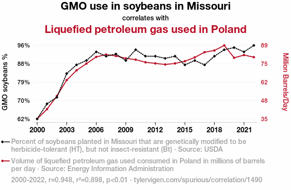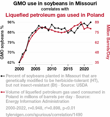 User prompt: Please make up a funny explanation for how an increase in GMO use in soybeans in Missouri caused Liquefied petroleum gas used in Poland to increase.