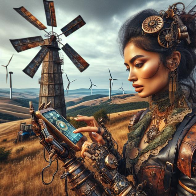 ChatGPT: Generate an image of a rustic, steampunk-inspired wind turbine standing tall in the rolling hills of Bulgaria, with its weathered blades catching the breeze. In the foreground, a person in steampunk attire is holding a vintage-looking smartphone, furiously typing a query into the search engine: "how to make baby." Capture the juxtaposition of old and new technologies against the picturesque landscape.