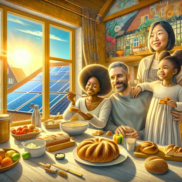 Prompt: Generate an image of a vibrant Discovery magazine cover that portrays a warm, inviting kitchen scene in Germany. Within the kitchen, a family savors a delightful breakfast, their expressions capturing a sense of comfort and contentment. The freshly baked bread, adorned with decadent golden butter, exudes an irresistible aroma. Outside the window, the solar panels on the rooftop gleam in the sunlight, serving as a modern and sustainable source of energy for the household. The warm, radiant colors and detailed textures enhance the sense of domestic bliss and environmental responsibility. The depiction should include only scenes, people, and objects, it should not include text or speech bubbles.