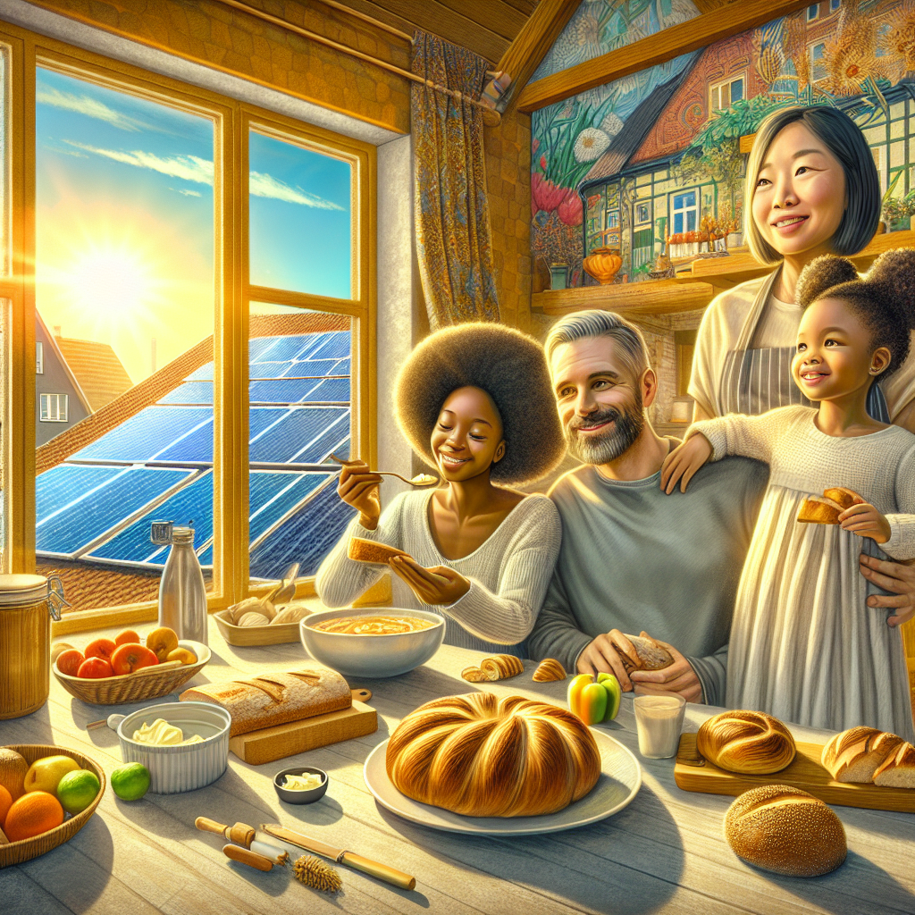 ChatGPT: In a sunny kitchen in Germany, a family enjoys a delicious breakfast of warm bread spread with rich, golden butter. Meanwhile, outside, on the roof of their home, solar panels glisten in the sunlight, capturing the energy needed to power their household.