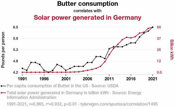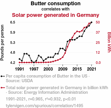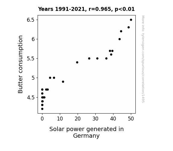 This means 93.2% of the change in the one variable (i.e., Solar power generated in Germany) is predictable based on the change in the other (i.e., Butter consumption) over the 31 years from 1991 through 2021.