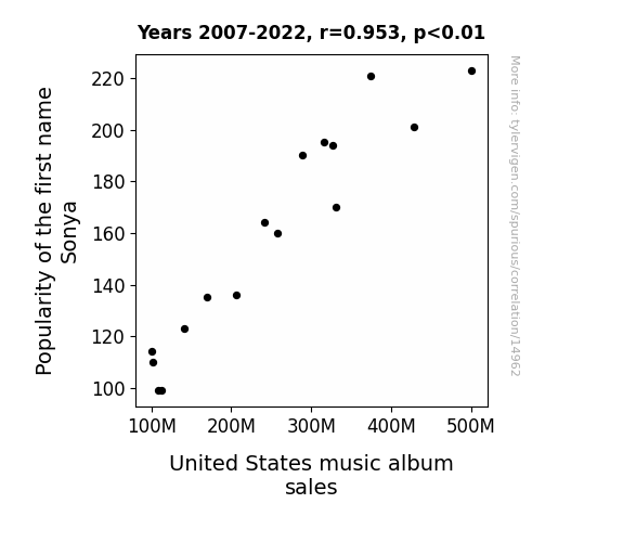 This means 90.9% of the change in the one variable (i.e., United States music album sales) is predictable based on the change in the other (i.e., Popularity of the first name Sonya) over the 16 years from 2007 through 2022.