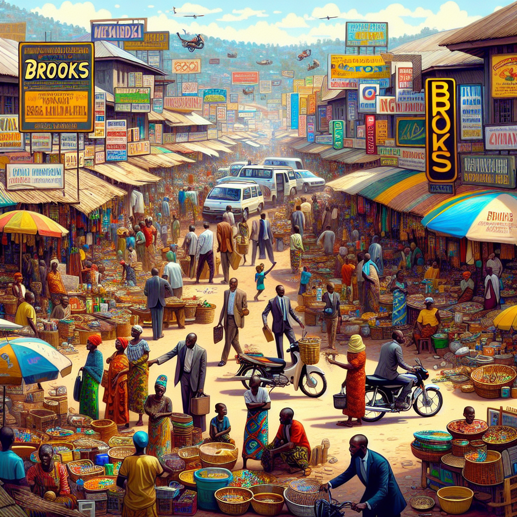 Prompt: Generate an image of a vibrant marketplace in Burundi, featuring colorful stalls and shops selling traditional goods. A prominent sign bearing the name "Brooks" stands out. In the background, depict people bustling around while utilizing motorbikes and cars relying on fossil fuels for transportation. Capture the lively atmosphere of the market and the juxtaposition of traditional commerce and modern transportation. The depiction should include only scenes, people, and objects, it should not include text or speech bubbles.