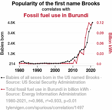 This means 93.3% of the change in the one variable (i.e., Fossil fuel use in Burundi) is predictable based on the change in the other (i.e., Popularity of the first name Brooks) over the 42 years from 1980 through 2021.