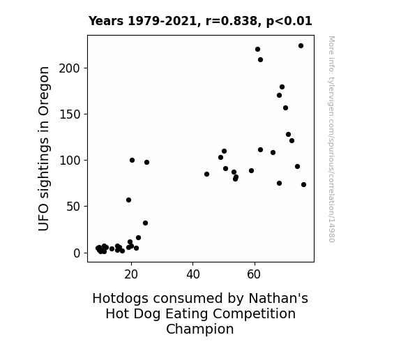 This means 70.3% of the change in the one variable (i.e., Hotdogs consumed by Nathan's Hot Dog Eating Competition Champion) is predictable based on the change in the other (i.e., UFO sightings in Oregon) over the 43 years from 1979 through 2021.