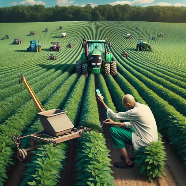 ChatGPT: In a Wisconsin soybean field, a farmer is examining the vibrant, genetically modified soybean plants. Nearby, a person sits on a tractor with a smartphone in hand, frustratedly typing "I cant even" into a Google search.